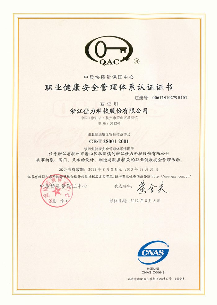 職業健康安全管理體系認證證書