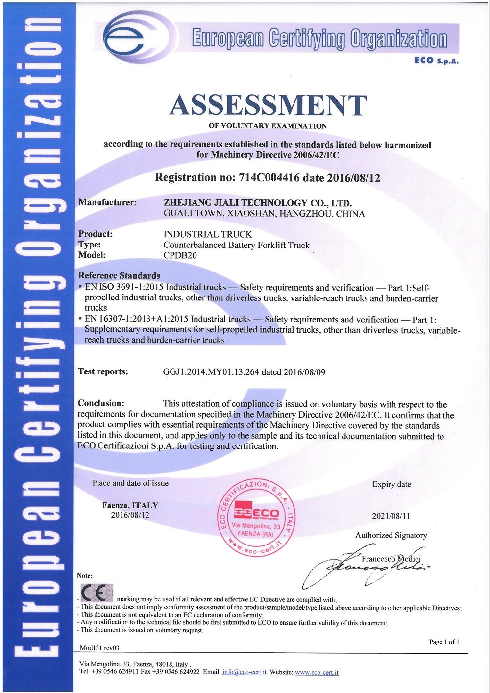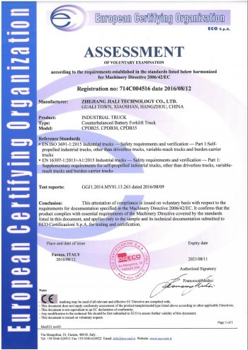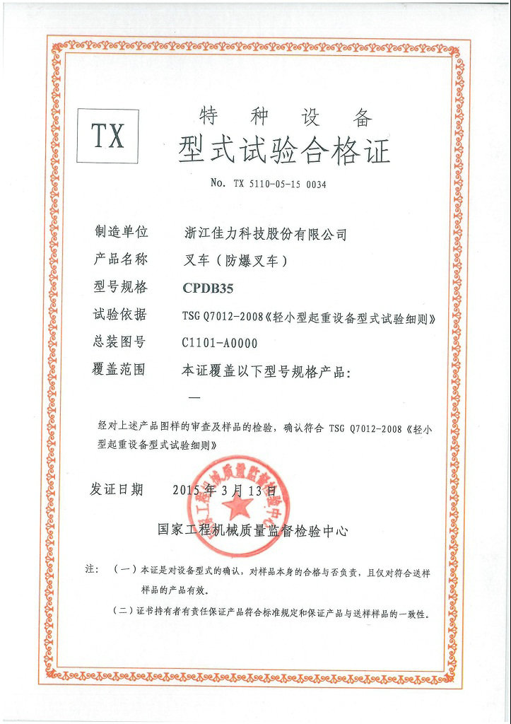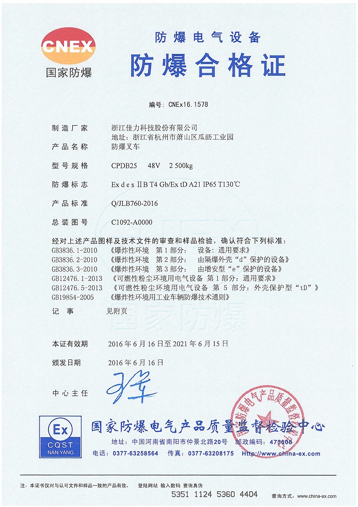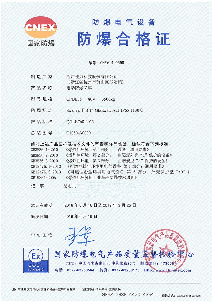 型 號 | 單位 | CPDB20 | CPDB25 | CPDB30 | CPDB35 | 額定起重量 | kg | 2000 | 2500 | 3000 | 3500 | 載荷中心距 | mm | 500 | 最大起升高度 | mm | 3000 | 門架傾角(前/后) | ° | 6/12 | 最小轉彎半徑 | mm | 2110 | 2270 | 滿載爬坡度 | % | 15 | 13 | 外型尺寸 | 長 | mm | 3435 | 3605 | 寬 | 1200 | 1250 | 高 | 2150 | 2160 | 2170 | 自重 | kg | 4000 | 4600 | 4870 | 5050 | 取得認證 | - | 型式試驗認證、防爆認證、CE認證 | 防爆標志 | - | Ex desⅡBT4/Ex tD A21 IP65 T130℃ | 適用防爆區(qū)域 | - | 1區(qū)、2區(qū)和21區(qū)、22區(qū) | 爆炸性氣體組別 | - | IIB | 溫度級別 | - | 135?C (T4) | 認證機構 | - | 國家防爆電氣產品質量監(jiān)督檢驗中心(中國南陽) |